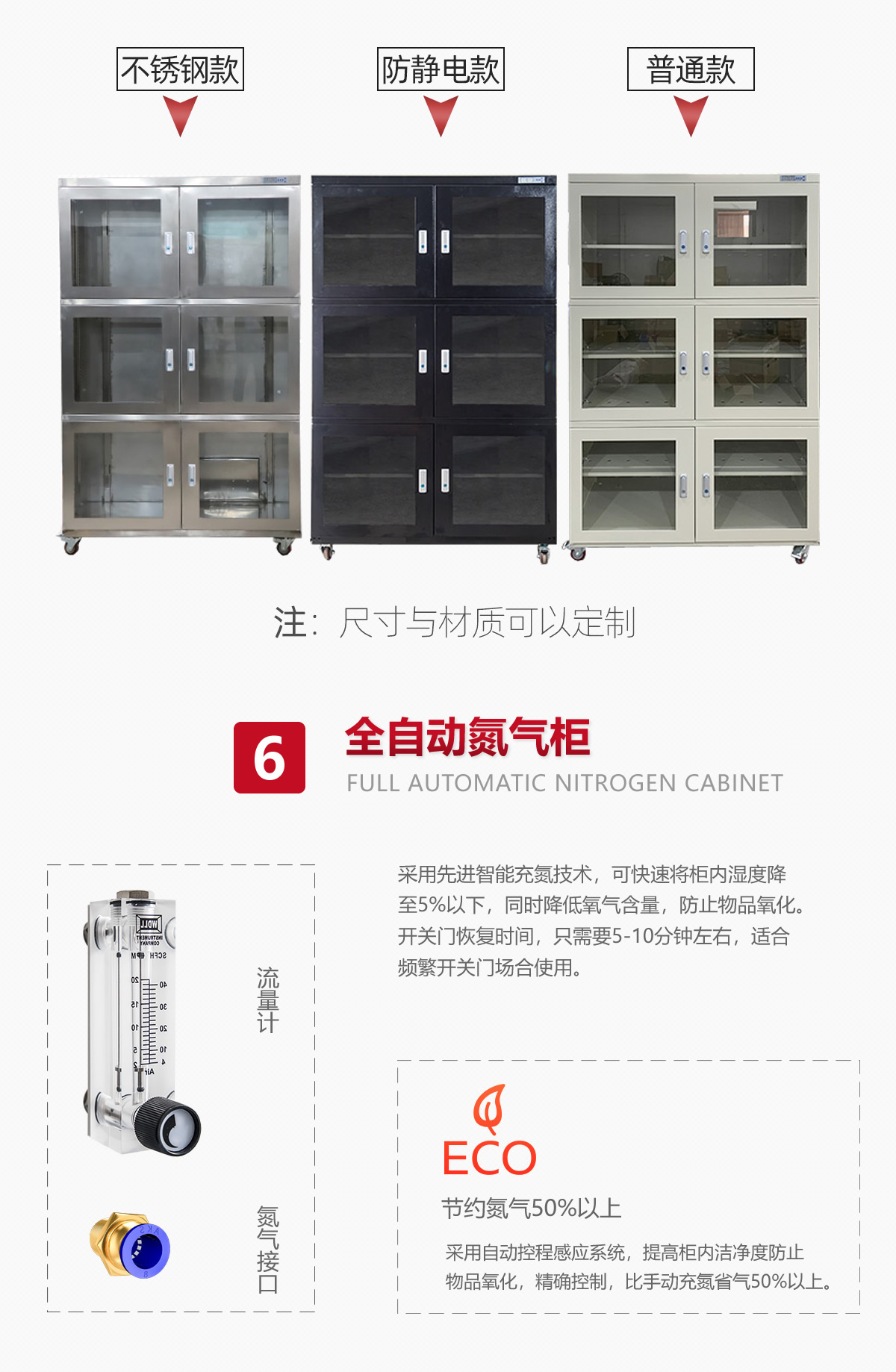 节能氮气柜是利用氮气来达到防氧化防潮目的柜体,氮气柜i具有送氮和排气的通路这种控制方式,可真正做到对内部含氧量的控制,有目的起到防氧化功能,同时也有更高的节氮功能。被广泛应用在微电子,半导体,新能源,国防,军工行业的研发生产工序,用于各类贵金属材料,半导体器件和敏感器件的防氧化保存。