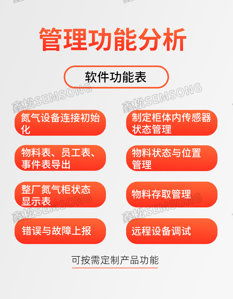 智能氮气柜是利用氮气来达到防氧化防潮目的柜体,氮气柜具有送氮和排气的通路这种控制方式,可真正做到对内部含氧量的控制,有目的起到防氧化功能,同时也有更高的节氮功能。被广泛应用在微电子,半导体,新能源,国防,军工行业的研发生产工序,用于各类贵金属材料,半导体器件和敏感器件的防氧化保存。